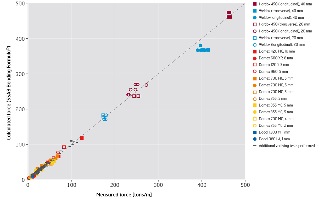 The SSAB Bending Formula© is verified by tests for 90° bends, see figure 5.