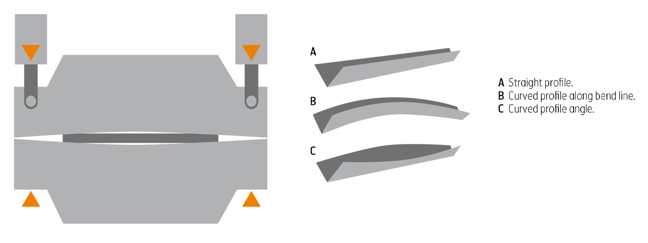 To make an estimation of the force needed during bending, we pay attention not only to the bend length, plate thickness, die width and tensile strength, but also the changing moment arm during bending. The peak load is assumed to be reached at a bend opening angle of 120° with normal friction (no lubrication). Trial tests are always recommended.